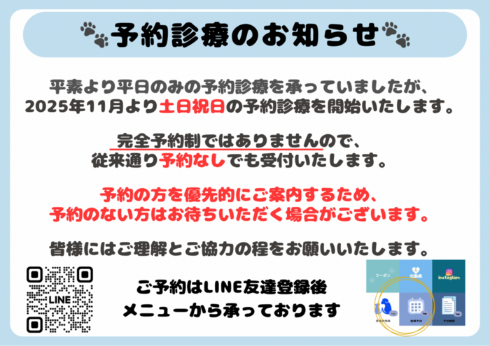 2025年11月より土日祝日の予約診療を開始いたします。