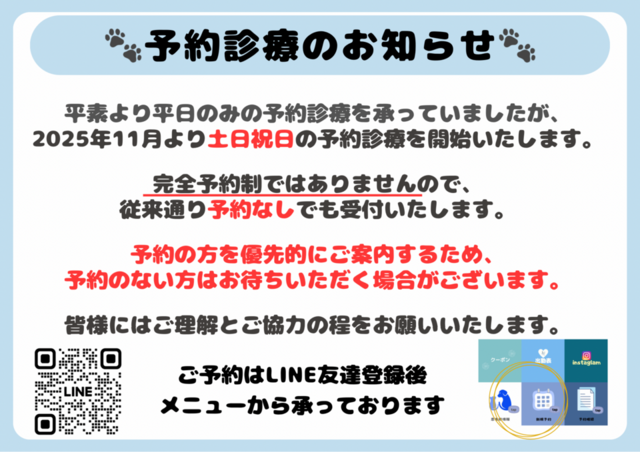 動物病院うみとそらでは、平素より平日のみ予約診療を承っておりましたが、